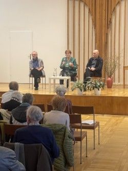 v.L.n.R. Herr Pfarrer Lehmann, Berlin, Frau Elke Chvojka (Moderation), Herr Dr. Phil. Theodor Ziegler, Religionspädagoge - in der Diskussionsrunde,