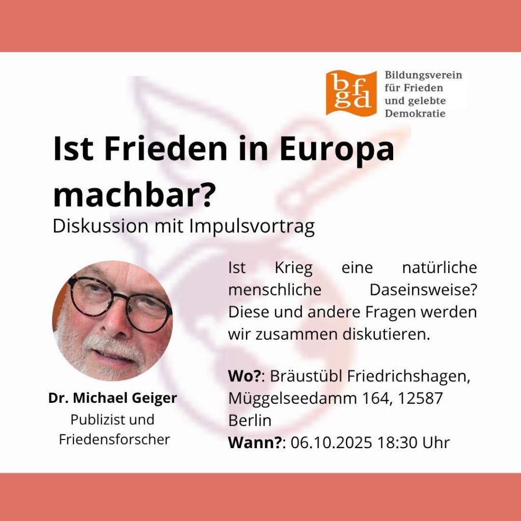 Wir waren uns als Teilnehmer alle darüber einig, dass es zum Thema Frieden nur ein erster Problemaufriss sein mag, was man in 2,5 Stunden erörtern kann. So haben wir einen Fragen- und Schwerpunktkatalog zusammengetragen, zu dem wir weiter im Bildungsverein arbeiten müssen.